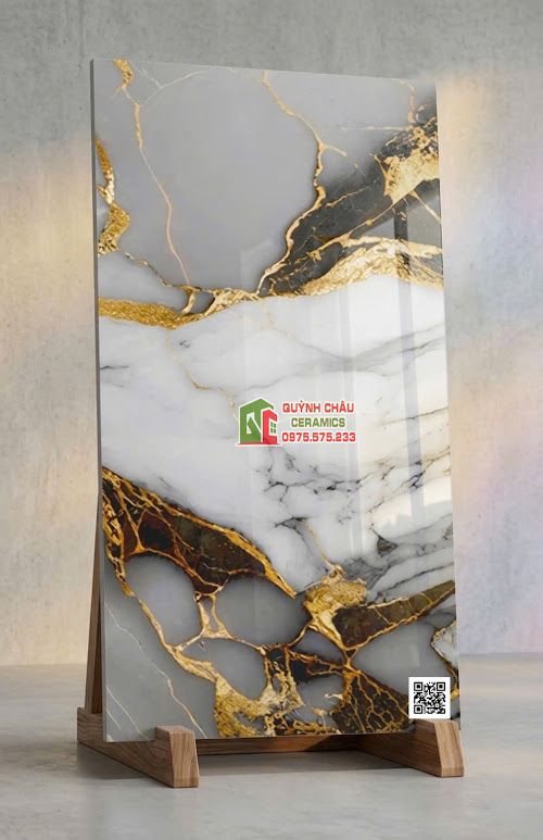 Lấy cảm hứng từ dòng đá Calacatta lừng danh, sản phẩm sở hữu tông nền trắng tinh khôi, điểm xuyết bởi những đường vân màu xám đen mạnh mẽ hòa quyện cùng sắc vàng kim quý phái. Sự phối màu tinh tế này không chỉ tạo nên hiệu ứng thị giác nổi bật mà còn giúp không gian trở nên bừng sáng, tràn đầy năng lượng và sự thịnh vượng.