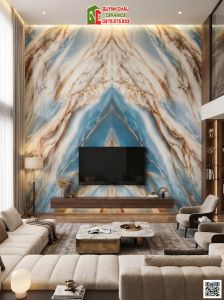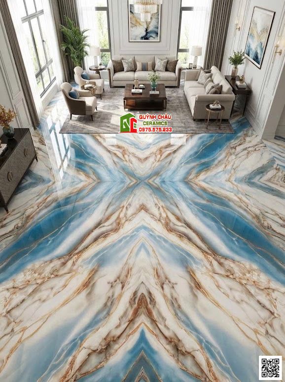 - Ốp lát phòng khách và Vách tivi: Đây là vị trí "vàng" để phô diễn vẻ đẹp của gạch vân đối xứng. Một bức vách tivi sử dụng gạch xanh dương vàng ngọc sẽ trở thành tâm điểm thu hút mọi ánh nhìn, thể hiện gu thẩm mỹ tinh tế của gia chủ.
