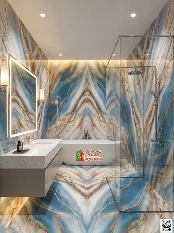 Sự kết hợp màu sắc là một bản giao hưởng đầy mê hoặc: tông màu xanh dương sâu thẳm của đại dương hoặc đá quý được điểm xuyết bởi những đường vân vàng nâu và vân ngọc lấp lánh. Sự đan xen này tạo ra hiệu ứng thị giác mạnh mẽ, vừa mang nét cổ điển quý phái, vừa đậm chất hiện đại. Bề mặt men siêu bóng (High Glossy) giúp phản chiếu ánh sáng tuyệt vời, làm cho các đường vân trở nên sống động, có chiều sâu 3D, khiến không gian như được mở rộng và bừng sáng.