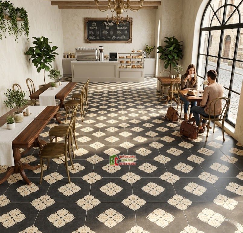 - Không gian thương mại & dịch vụ: Sự kết hợp giữa nét cổ điển và tối giản của viên gạch rất phù hợp với các mô hình kinh doanh yêu cầu gu thẩm mỹ nghệ thuật cao. Dù là lát nền nhà hàng sang trọng, ốp mặt quầy bar sành điệu, hay trang trí các mảng tường tại quán coffee và homestay, mẫu gạch này đều giúp kiến tạo một không gian "check-in" cực chất, thu hút và giữ chân khách hàng ngay từ ánh nhìn đầu tiên.