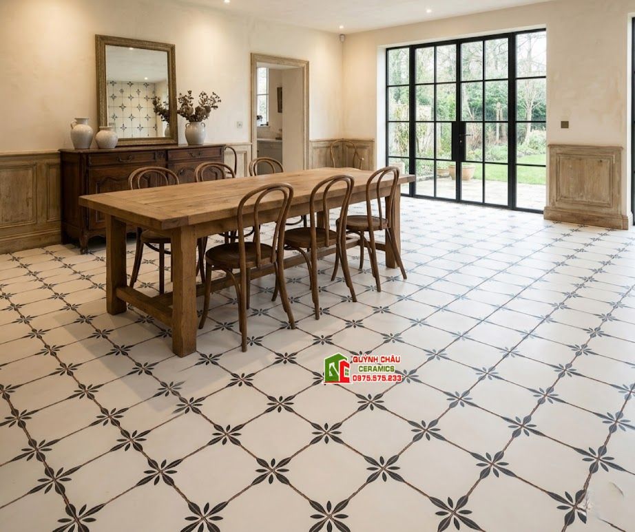 Đặc biệt, nhằm tăng thêm tính thẩm mỹ chân thực, cạnh gạch được điểm xuyết bằng các đường giả mạch màu nâu nhạt với hiệu ứng giả cổ. Chi tiết nhỏ nhưng đắt giá này tạo ra chiều sâu cho sàn nhà, tái hiện lại trọn vẹn vẻ đẹp nguyên sơ, nhuốm màu thời gian của những viên gạch xi măng truyền thống xưa kia.