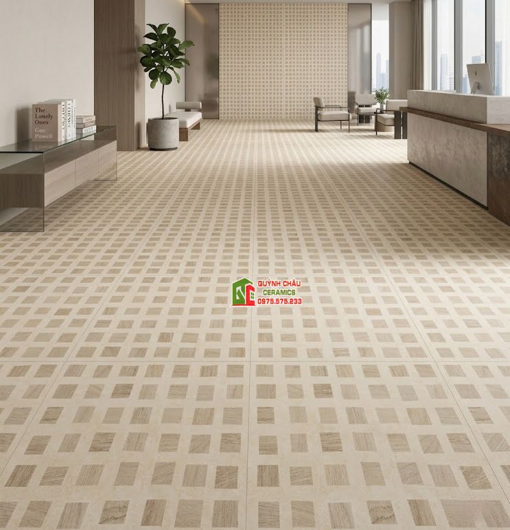 Bên trong mỗi viên gạch là những họa tiết ô vuông nhỏ đan xen, mang tông màu vân gỗ nhạt, xám nhạt và vàng beige. Những họa tiết này được thiết kế công phu để mô phỏng chân thực đường nét của vân đá và vân gỗ tự nhiên, sắp xếp theo dạng nghệ thuật mosaic. Tổng thể viên gạch toát lên một vẻ đẹp tối giản, cổ điển nhưng lại vô cùng phong cách và sang trọng, dễ dàng chinh phục mọi ánh nhìn.